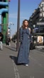 PARIS, FRANCE - MARCH 02: (SLOW-MO) Charlene Choi wears a blue denim halter-neck cropped tank-top, a matching blue denim buttoned nailed / studded long coat, matching navy blue nailed / studded wide legs pants, a black shiny leather with braided borders details handbag, white shiny leather ankle boots , outside Chloe, during Paris Fashion Week - Womenswear Fall Winter 2023 2024 on March 02, 2023 in Paris, France. (Footage by Edward Berthelot/Getty Images)