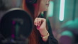 Cheerful female content creator live streaming from her home setup, engaging her audience in real time through her smartphone, sharing behind-the-scenes moments and daily routines, blending lifestyle content with personal branding and interactive storytelling