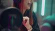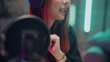 Cheerful female content creator live streaming from her home setup, engaging her audience in real time through her smartphone - 4K 影片檔