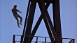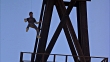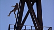 PAN DOWN AS STUNTMAN SUSPENDED ON WIRE FALLS DOWN AN OIL RIG. MEN. WORKERS. STUNTS.