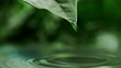 Extreme close up super slow motion droplet falling from green leaf,rippling water surface