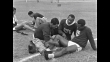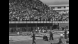Flags of various countries fly atop flagpoles at Bolivarian Games / angle shot of crowd in Olympic Stadium, pan across to track / flags of various countries fly atop flagpoles / CU legs and feet of runner warming up / coach rubs leg of runner sitting on ground / two runners from Peru lie on ground warming up / crowd in stands, pan across crowd / contestants run in women's 50-meter race, Panamanian runner Carlotta Gooden winning / CU official holding starting gun up in air / contestants run in women's 80-meter hurdle race / hurdlers race towards camera, Aida Awyin of Ecuador winning / Awyin stands in group of people, her arm around man next to her / Note: exact day not known