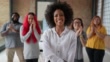 Portrait of a businesswoman being applauded by the team in the office