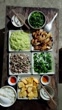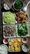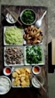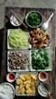 Directly above view of a dinner prepared by H'Mong ethnic people for guests, clockwise from left to right: green mustard leaf soup, vegetable paper rolls, boiled green mustard leaves, persimmons, steamed rice, stirred pork, and stirred chayote squash.