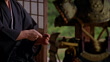 Reenactment medium shot katana sheathed in scabbard on stand / tilt up armor and samurai polishing sword in background - HD 影片檔