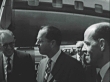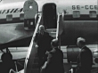 MONTAGE Actor Maurice Chevalier arriving at Los Angeles International Airport and being greeted on the tarmac by press / Los Angeles, California, United States
