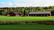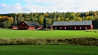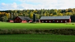 Tumba Sweden rural farming dairy with barn and home in green fields in Fall colors - HD 影片檔