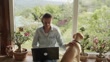 Mature adult woman working from home at countryside. She is sitting on floor and cuddle her lovely dog while using lap top. They are surrounded with potted plants at beautiful sunny day and she is using laptop.